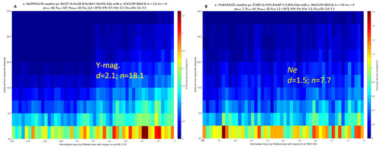 - The anticipation time “” of the anomaly increases with the magnitude of the incoming earthquakes following the Rikitake laws [], with these specific coefficients being and for the magnetic field “mag” and electron density data, respectively. The anticipation time of large earthquakes (M7.5+) seems to be some years before the event and has been detected.