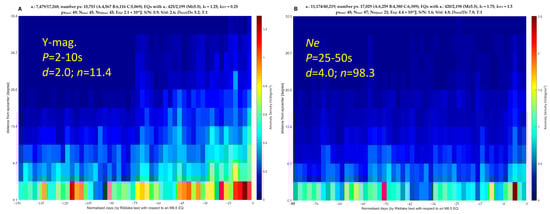 Figure 7 shows the results for the Swarm data without taking into account the frequency of the signal. The maximum concentration has a higher statistical significance with respect to the previous analyses: in fact, for the magnetic field data, d passes from 1.7 to 2.1, and for the Ne data, d passes from 1.3 to 1.5, which also means that, from a non-statistically significant result, we obtain a higher significance with this different superposed time approach, which implies that we could better investigate the identified anomalies to search for seismo-ionospheric disturbances.