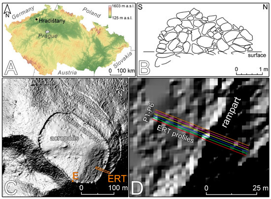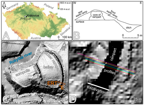 - Klanica, R.; Křivánek, R.; Grison, H.; Tábořík, P.; Šteffl, J. Capabilities and limitations of electrical resistivity tomography for mapping and surveying hillfort fortifications. Archaeol. Prospect. 2022, 1–16. [Google Scholar] [CrossRef]