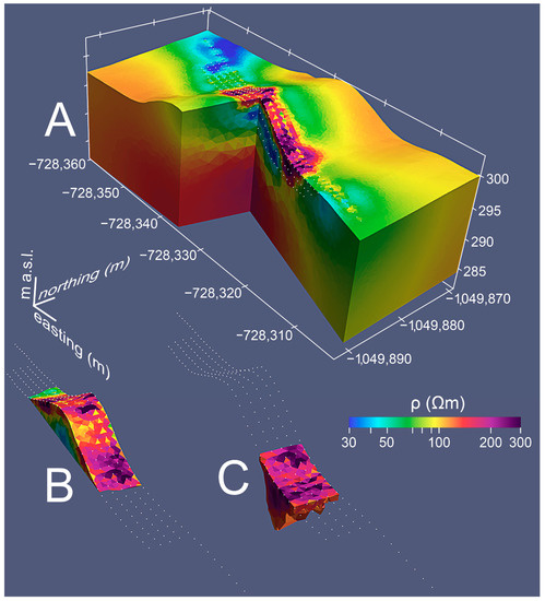 - Loke, M.H.; Barker, R.D. Rapid least-squares inversion of apparent resistivity pseudosections using a quasi-Newton method. Geophys. Prospect. 1996, 44, 131–152. [Google Scholar] [CrossRef]