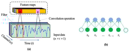 Convolutional neural networks are widely applied in extracting features from multiple dimensions data with Euclidean space [33,34]. A typical CNN model consists of a convolution layer, an activation layer, a pooling layer, and a fully connected layer. On the convolution layer, a set of trainable filters slide over the input data to perform a convolution operation and extract features; they are called feature maps. The individual units in feature maps correspond to the local positions of original input that the filter currently covers [35] (Figure 1). In addition, at every local region of input data, the convolution filter uses the same weights. This is the weight-sharing strategy, which can reduce the complexity of the convolution layer and the number of parameters that are required to be trained. The pooling layers usually follow the convolution layer, and adjacent information in the feature maps is merged by max pooling, average pooling, or other operations. Finally, the fully connected layer is used to transform the features processed by convolution and pooling layers into one-dimensional vectors for conveniently processing and outputting results. The activation layer puts nonlinear functions into the neural network, which can improve the nonlinear expression ability of the model. The commonly used activation equations are the Sigmiod function, the ReLu function, and the Tanh function, etc. Actually, according to different tasks and dimensions of input, data that needs to be processed by CNN can be divided into three different dimensions network structures. The one-dimensional CNN (1D-CNN) model is used for sequential data and is applicable to signal processing problems. The time-series data were processed as different channels data that not only can build nonlinear relationships between different input features but also merge nearby time-step data by the convolution layer and pooling layer in the 1D-CNN model. So, the 1D-CNN model can extract temporal features from original sequence data. The two-dimensional CNN (2D-CNN) model is mainly used for image and text recognition, and the three-dimensional CNN (3D-CNN) model is used for video data. Thus, in this study, the 1D-CNN model was also applied in landslide displacement prediction for competition with the TCN model.