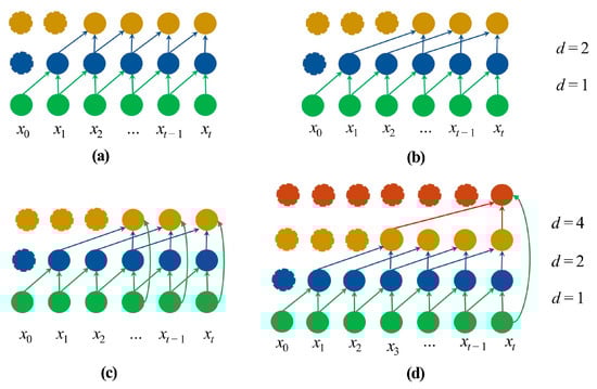 Causal convolutions are convolutions where the output at time t can only depend on the inputs that are no later than time t, as shown in Figure 2a. However, the insufficient receptive of the causal convolution layer has a limited ability to capture global information. In order to capture much longer sequence information, the dilation strategy through interval sampling is applied to obtain larger perception. For a given input 1-D dimension sequence x, the output at time t of the dilation convolution layer can be defined as: