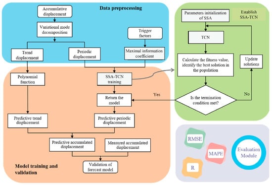 Based on the time-series decomposition method mentioned above, we proposed a temporal convolutional network (TCN) optimized by SSA as shown in Figure 3. Firstly, the total displacement of the landslide is decomposed into two displacement sub-sequences named periodic term and trend term. The trend term is fitted and predicted by a polynomial function. Through the analysis of the monitoring data, the external candidate factors that trigger the periodic displacement are preliminarily selected, and the maximal information coefficient (MIC) [41] method is used to quantitatively determine the correlation value between the candidate factors and periodic displacement. The SSA is applied to optimize the hyperparameters of the TCN model. Then, the trained model is used to predict the periodic component displacement. The predicted result of the cumulative displacement is the sum of the predicted periodic displacement and trend displacement.