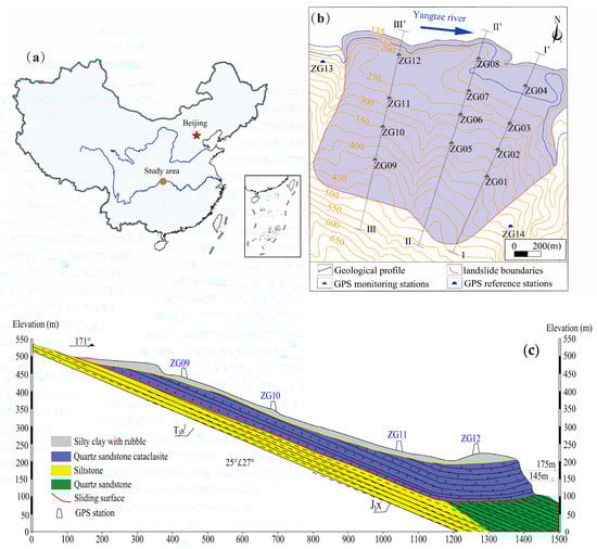 The Muyubao landslide on the slope of the south bank of the Yangtze River is located in the county of Zigui country of Hubei province, 56 km away from the Three Gorges Dam (Figure 4a). The average annual rainfall in this study region is 1493.2 mm. The rainfall is concentrated from July to September, counting 70% of the cumulative rainfall each year. The Muyubao landslide is a large-scale unstable slop that includes a volume of 96 million m3 sliding mass, an area of 1.8 km2. The landslide has a maximum north-to-south length of about 1500 m and an average width of about 1200 m on the different direction (Figure 4b). The upper boundary of the landslide is at an elevation of 540 m above sea level (a.s.l.), and the toe of the landslide dips into the Yangtze River at 100 m (a.s.l.). The upper portion of the landslide shows a steep slope gradient of nearly 25° and gently lowers with the elevation decrease. The sliding mass is mainly composed of a surficial quaternary deposit and fractured quartz sandstone, as shown in Figure 4c. The surficial deposit is composed of silty clay and rubble, which makes up 40–60% of the total volume. The thickness of sliding mass ranges from 60 m to 120 m, and the front part is an uplift platform formed by shear sliding with a thickness of 80~120 m. The main sliding direction of the landslide is 20°, which faces the Yangtze River. The bedrock mainly consists of Jurassic siltstone and Triassic quartz sandstone with dip directions of 27° and dip angles of 25°. The sliding zone is a thickness of 0.1 to 0.3 m layer of dark-gray to black coal and shale that extends along the interface between the bedrock and the sliding mass [42,43].