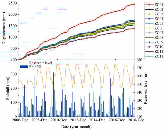 The landslide displays slow creep character before the initial TGR impoundment (June 2003), and activity signs including the ground fracture and infrastructure damage occurred rarely. However, by the filling-drawdown cycle of the reservoir level after 2003, the landslide deformation is gradually obvious, especially after the first trial impoundment to 156 m a.s.l. (November 2006). Since then, a total of 12 GPS points is set up on the Muyubao landslide in a regular form of three rows and four columns for surface displacement monitoring. The distribution of monitoring points is depicted in Figure 4b, and the other two reference stations (ZG12 and ZG13) are located on stable rock, which is out of the sliding area. The GPS is a kind of GNSS that can provide millimeter accuracy for landslide displacement monitoring [44]. The long-term GPS displacement monitoring results in Figure 5 indicated that most of the area of Muyubao exists at a similar displacement rate (except for ZG01, which is affected by the topography conditions). The displacement around section Ⅰ-Ⅰ’ is the most significant, with a total displacement of 2447.9 mm (ZG01), 1693.0 mm (ZG02), 1678.9 mm (ZG03), and 1756 mm (ZG04). The displacement recorded by ZG05, ZG06, ZG07, and ZG08 around the central section of Ⅱ-Ⅱ’ of the landslide are similar at cumulative displacement between 1560 mm with 1630 mm and an average velocity of about 10.96 mm/month. Compared with the other points, the displacement data measured by the four GPS station sites around profile III-III’ on the west of the landslide show the lowest displacement, with an average cumulative displacement of 1521 mm. During the whole 12-year monitoring period, the horizontal displacement of the Muyubao landslide displays a linear creep character, but several significant displacement events were observed in the overall monitoring period. There are four evident acceleration events (2007, 2008, 2012, and 2017); each rapidly increased event was usually during a periodic of approximately 5 months (from November to April of the following year). During the four periods, the displacement increased approximately 30% of the total displacement observed in the December 2018. Moreover, the landslide displacement rapidly increased corresponding to the periods of relatively higher reservoir water level every year, while during the rest of the year, the landslide displacement experienced a slower increase, which corresponds to the relatively lower reservoir level period.