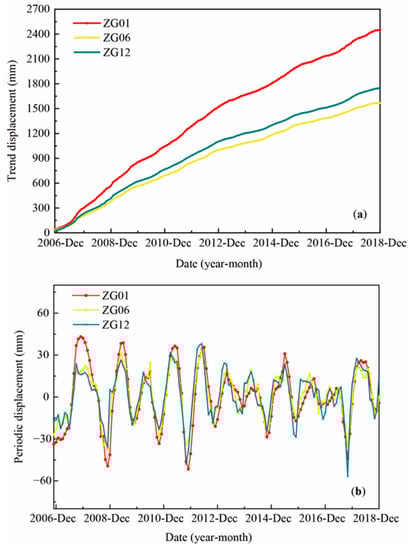 The extracted displacements from ZG01, ZG06, and ZG12 by VMD. (a) Trend displacements; (b) periodic displacements.