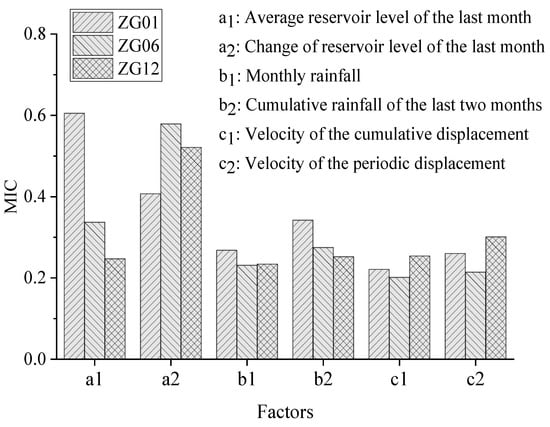 The displacement of slope is usually considered as a complex multi-dimension nonlinear system at spatiotemporal scale [49]. The complexity and uncertainty of the geological conditions and the randomness and suddenness of external factors are the two main aspects that impart the nonlinear characteristics to the displacement system. Correlation coefficients, such as Pearson’s correlation coefficient, are usually used as feature selection algorithms due to their simple but practical character. However, these methods cannot usually provide a nonlinear relationship between inducing factors and displacement [50]. The maximal information coefficient (MIC) based on the statistical method is used for capturing the correlation between two variables. MIC not only calculates linear and non-linear correlations but also can identify important and difficult-to-recognize correlations [41,51]. Hence, the MIC was applied to identify and screen the environmental factors that induce landslide displacement in this research. The MIC value is between 0 and 1. If two variables show strong dependence, the MIC value is close to 1. Otherwise, it will tend to 0. Figure 7 presents linear and nonlinear relationships (MIC values) among the selected factors and the displacement at selected points of the Muyubao landslide. The MIC values of all candidate factors are equal to or greater than 0.2, revealing the strong correlation relationship between candidate factors and periodic displacement. So, the six candidate factors are selected as the input factors to predict the periodic displacements. In the following, the six factors data were constructed into a six-channel data, and each channel was used to input one factor time-series data, which is similar to the input data shown in Figure 1a, which can be processed by the TCN and 1D-CNN models.