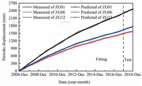 Through a detailed observation of the displacement time series, several displacement curves can be found with similar displacement trend such as ZG02 and ZG03, ZG05 and ZG06, ZG07 and ZG08, ZG10 and ZG11, and ZG04 and ZG12. Hence, the other two points (ZG01, ZG09) and the five typical points (ZG03, ZG06, ZG08, ZG11, and ZG12) from each pair of GPS points with similar displacement were selected to evaluate the performance of the proposed method. These typical points were located around the three geological profiles (I-I’, II-II’ and III-III’) from the trailing edge to the former edge which can respect to the displacement status of the whole slope. For each GPS point, a total of 146 displacement samples were obtained by monthly recording from November 2006 to December 2018. In order to clearly provide the results of the proposed method in this study, in the following parts, the calculation results visualized in figures were based on the three points (ZG01, ZG06, and ZG12), and all seven points of the calculation results were specifically presented in tables. Figure 6 shows the trend and periodic displacement time-series that were extracted by VMD. The curves with approximately linear growth correspond to the trend displacements. The curves with high fluctuation frequency correspond to the periodic displacement components and show a similar one-year cycle of displacement characterized by acceleration from October to March or April of the following year and descending during April to September. During the four acceleration events (2007, 2008, 2012, and 2017), the average increments of periodic displacements were 50.72 mm, 72.32 mm, 81.27 mm, and 71.27 mm, and the average monthly trend displacements were 24.63 mm, 19.96 mm, 14.87 mm, and 15.13 mm, respectively. In the rest of these years, the average monthly trend displacements were 15.58 mm, 19.08 mm, 16.49 mm, and 12.53 mm, respectively. The trend displacement increase rates were similar even during the period with a displacement rapid increase, so the trend displacements can show an approximate line increase.