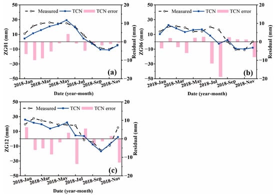 The predicted and measured cumulative displacements at (a) ZG01, (b) ZG06, and (c) ZG12.