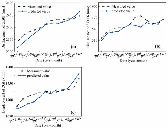 A comparison of the predicted and measured displacements: (a) ZG01, (b) ZG06, and (c) ZG12.