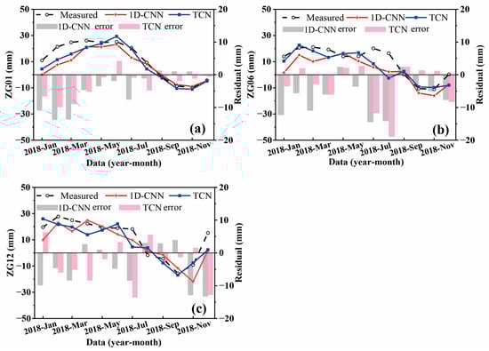 The period displacement prediction component and the trend term displacement prediction component are added to obtain the cumulative displacement prediction value of the landslide. From January to December 2018, the average values of RMSE, MAPE, and R of TCN are 15.89 mm, 0.85%, and 0.922, respectively (Table 4). Figure 10 shows that the predicted cumulative displacements based on the polynomial of degree five and the TCN model are in good agreement with the measured displacement of the monitoring points. This is due to the hybrid models providing an integrated learning strategy, which can reduce the complexity of the time-series displacement, and relatively simple nonlinear and nonlinear models can realize high accuracy prediction.