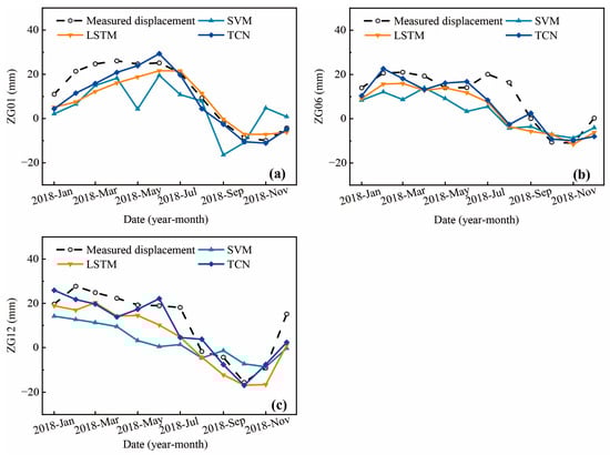 A comparison of monitored and predicted periodic displacements using three prediction models for different sites: (a) ZG01, (b) ZG06, and (c) ZG12.