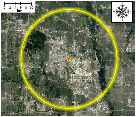 Location of the 3 radar sensors (designated by a star) in relation to the airfield at Chicago’s O’Hare International Airport, USA. The circular lines represent an area around the radars with a 10–km radius (denoted in yellow).