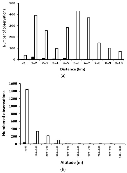 The distribution of the number of red-tailed hawk locations derived from satellite telemetry that were determined to be in the beam of one or more of three radars and were not associated with a radar track (white bars) and well as the number of locations that were associated with a radar track (black bars) with respect to (a) the distance of the hawk from the radars (in km) and (b) the altitude of the hawk (in m) during a study at Chicago’s O’Hare International Airport, USA, from September 2010 to May 2014.