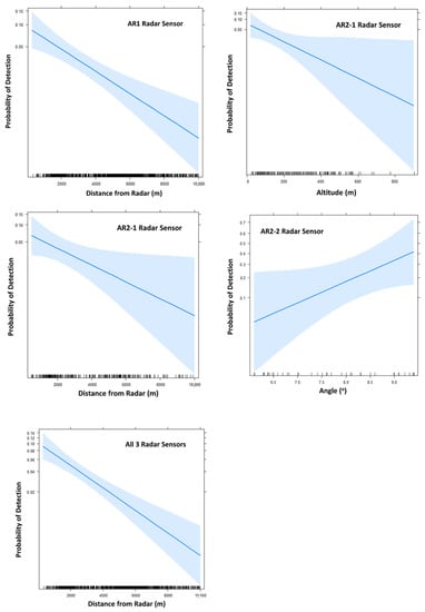 The other factors we evaluated (i.e., target altitude, angle, and air temperature) had limited or no influence on the performance of the avian radars. Only the AR2-1 radar sensor’s performance was related to the flight altitude of the hawks. Contrary to our expectations and the findings of a previous study [29], the ability of the AR2-1 radar to detect and track the hawks actually decreased with increasing bird altitude, although the AR2-2 radar was more effective when the hawks were in the upper portions of the radar beam relative to the lower portions of the same radar beam. We suspect challenges with ground clutter are considerable within the environment at our study location [25,29], and perhaps this factor was more problematic in the lower parts of the AR2-2 radar beam.