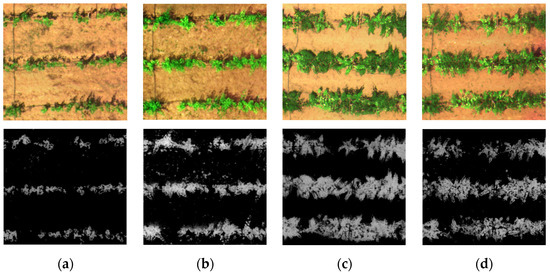(a) Effects of eliminating soil background at new shoot growth stage (8 May 2021); (b) effects of eliminating soil background at flowering stage (31 May 2021); (c) effects of eliminating soil background at fruit expansion stage (22 June 2021); (d) effects of eliminating soil background at veraison and maturity stage (23 July 2021).