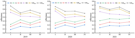The canopy spectral reflectance variation trend observed throughout the whole grape growth period from 2019 to 2021 was nearly consistent, but obvious differences were observed between different bands in each growth stage (Figure 4). With the advancement of the grape growth period, the reflectivity of the B, G and R bands presented overall upward trends, and the reflectances of the NIR800 and NIR900 bands showed overall downward trends. However, during the fruit expansion stage, there was a slight decrease in the reflectivities of the B, G and R bands, while the reflectivities of the NIR800 and NIR900 bands increased slightly.