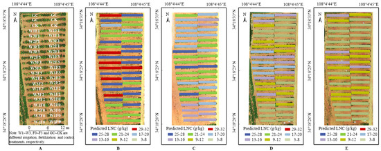 (A) Distribution map of grape with different treatments based on UAV image (22 June 2021). (B) LNC distribution map of grape in the new shoot growth stage based on UAV image (8 May 2021). (C) LNC distribution map of grape in the flowering stage based on UAV image (31 May 2021). (D) LNC distribution map of grape in the fruit expansion stage based on UAV image (22 June 2021). (E) LNC distribution map of grape in the veraison and maturity stage based on UAV image (23 July 2021).