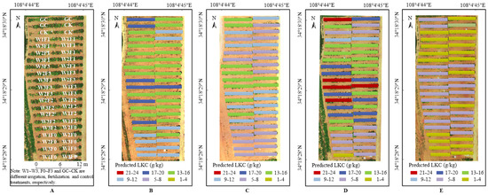 (A) Distribution map of grape with different treatments based on UAV image (22 June 2021). (B) LKC distribution map of grape in the new shoot growth stage based on UAV image (8 May 2021). (C) LKC distribution map of grape in the flowering stage based on UAV image (31 May 2021). (D) LKC distribution map of grape in the fruit expansion stage based on UAV image (22 June 2021). (E) LKC distribution map of grape in the veraison and maturity stage based on UAV image (23 July 2021).