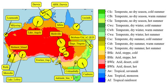 Köppen Climate Zones in Australia generated using Copernicus Atmosphere Monitoring Service information (2022) [24]. Overlain are the locations of the Aerosol Robotic Network (AERONET) sites used in this study (see Section 2.2.3). The size of the circle markers are proportional to the length of the data record available. The colour scheme used is taken from Beck et al. [24].