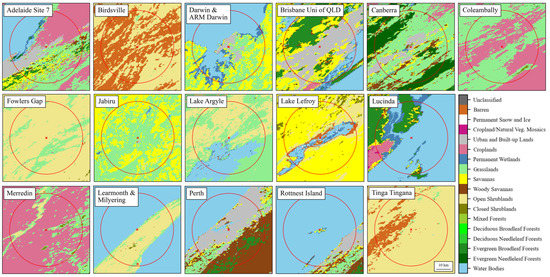 International Geosphere Biosphere Programme (IGBP) Land Surface Classification at 500 m resolution for each AERONET station (Year: 2016). Red circle is of radius 25 km around the sites.