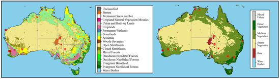 IGBP categories (left) and newly defined, simplified categories (right), with the location of AERONET stations indicted by red crosses.