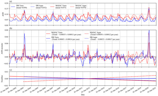 Monthly mean time series of Aerosol Optical Depth (AOD) for Deep Blue (DB) and Multi-Angle Implementation of Atmospheric Correction (MAIAC) over Australia (a), the deseasonalised time series, showing the AOD anomaly (b) and the fitted trendlines for these data (c), for all available land pixels.