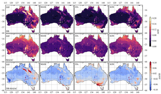 - Spatial analysis: The seasonally averaged spatial distributions of AOD for both the MAIAC and DB algorithms were generally consistent. Over large swaths of Australia, both algorithms retrieved very low average AOD, in all seasons, though values are higher for MAIAC. This spatial analysis also revealed differences in AOD peak areas between the two algorithms. Both showed a very spatially heterogeneous distribution of AOD in all seasons, with higher levels of AOD in the northern and eastern regions, which is particularly prominent in peak seasons (summer and spring). The MAIAC algorithm also shows strong peaks in AOD in the south-western regions in DJF, in areas covered in cropland.