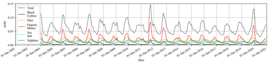 Five aerosol types are included in the CAMS reanalysis AOD product: black carbon, dust, organic matter, sea salt and sulphate. Black carbon and organic matter tend to be produced from similar emissions sources, including biomass burning (such as wildfires) and pollution from fossil fuels and combustion, meaning they have both natural and anthropogenic origins [32]. Organic matter aerosols are also produced from other biogenic sources [31]. Dust aerosols typically originate from arid and semi-arid environments as a result of wind induced uplift but can be entrained and carried substantial distances depending on their size [8]. Sea salt aerosols are generally produced as a result of sea spray and wave breaking, and near surface winds again play a role both in their formation and circulation, driving them over nearby land surfaces [32]. Sulphates can have both natural and anthropogenic origins, being produced naturally by volcanoes but also commonly in Australia by mining operations and industrial urban centres [33]. Here, we make use of the total and speciated AODs to determine spatio-temporal distributions of specific aerosol types over Australia for the period 2003–2020.