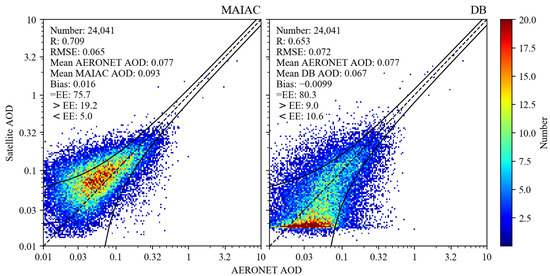 Results of the MAIAC and DB co-location to ground truth AERONET sites as a density scatter plot. The dashed black line is the 1:1 line, and the solid black lines are the upper and lower limits of the EE envelope. Statistics are printed on the graph representing the number of co-location matchups (Number), Correlation Coefficient (R), root-mean-square error (RMSE), Mean AOD, Bias and the percentage of points falling inside (=EE), above (>EE) and below (<EE) the Expected Error (EE) envelope. Note the log scale.