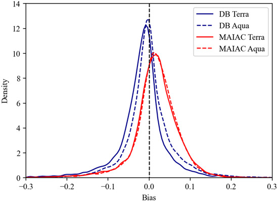 Bias distribution for MAIAC and DB over all Australian AERONET sites, separated into Terra and Aqua components.