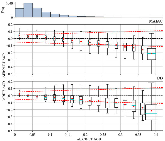 Box plots showing the MODIS-AERONET bias as a function of AERONET AOD for MAIAC (top) and DB (bottom). AERONET AOD was grouped into bins of 0.025. Plotted for each bin is the algorithms median and mean AOD value (blue line and red dot, respectively) and the interquartile range of values (box). The widths of the boxplots are proportional to the standard deviation of the retrieved AOD values for that bin. Points lying greater than two standard deviations from the mean AERONET value are not shown (for clarity). The frequency histogram shows how many co-location pairs make up each bin. The zero bias line is indicated by the black dashed line at x = 0 and the EE envelope is shown with the red dashed line.