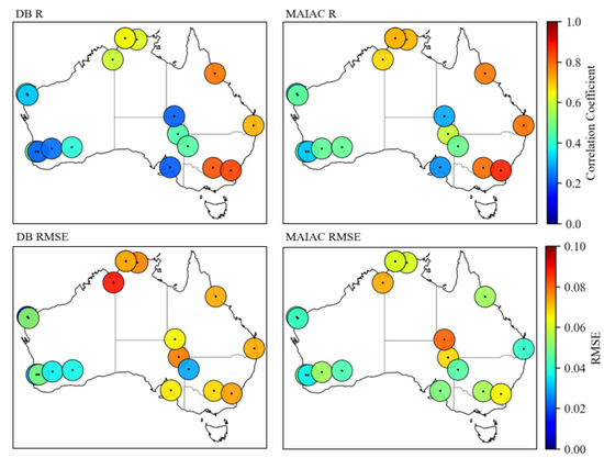 Correlations Coefficients (R, top) and RMSE (bottom) between satellite data (DB left and MAIAC right) and each AERONET station over Australia for collocations in the period 2001–2020. The operational period of individual AERONET sites is highly variable, extending from 1 month to 10+ years (refer to Table 1).