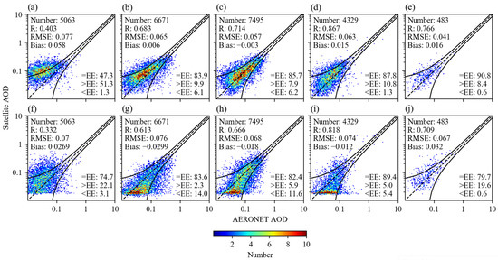 Results of the MAIAC (a–e) and DB (f–j) co-location to AERONET ground truth as density scatter plots and presented as a function of surface type, where: (a,f) Bare, (b,g) Sparse, (c,h) Medium, (d,i) Dense and (e,j) Mixed Urban. All stats and line indicators are as presented in Figure 8.