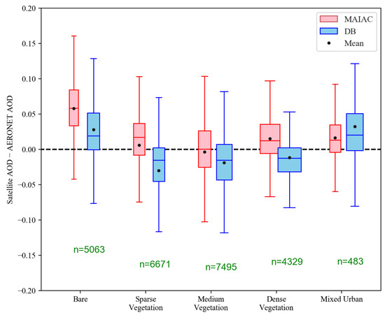 Box and whisker plots illustrating the bias variation as a function of surface type around the AERONET sites. Green text indicates the number of co-location pairs per category. Widths of the boxes are proportional to the standard deviations, and the central horizontal lines mark the medians. Fifty percent of data falls within the bounds of each box. Outliers have been removed—lower limit is the AOD value of the lower limit of the inter-quartile range (IQR) subtract 1.5IQR. Similarly, upper limit is upper quartile plus 1.5IQR.