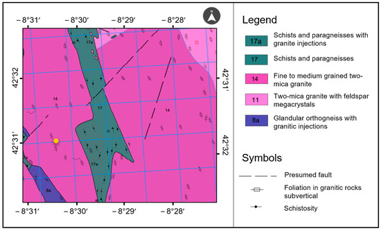 Figure 2 shows a detailed description of the geology environment around the baths of San Xusto. As can be observed, the contacts with the metasedimentary rocks are always very clear, with the presence of andalusite or sillimanite at various points of contact. Figure 2 also highlights the presence of faults and fractures, as well as subvertical foliation, which could explain the origin and circulation of the emergence of mineral waters in the site.