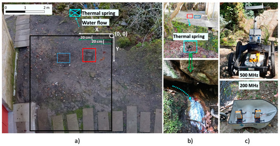 GPR setup: (a) 3D grid showing the location of the anomalies identified (red and blue boxes), (b) existence of a thermal spring in the area, and (c) 500 and 200 MHz antennas used for data collection.