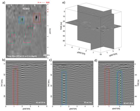 From the GPR data produced with the 500 MHz antenna, shown in Figure 4, the presence of two anomalies characterized by stronger amplitude values is easily observed, showing reflection patterns in the form of signal reverberation. These reflections are seen to be extended from ~1.0 to 1.5 m in y-line and 0.5 to 1.0 m in x-line, at a time-depth of ~10 ns (red boxes), and from ~1.2 to 1.6 m in y-line and 1.8 to 2.2 m in x-line, at a time-depth of ~15 ns (blue boxes).