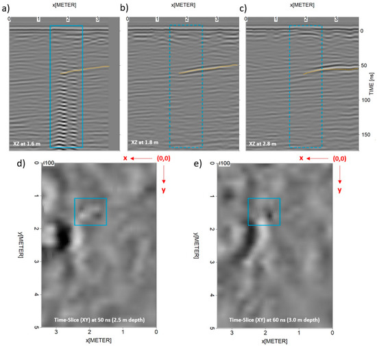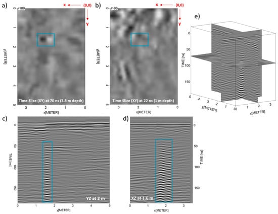 Regarding the GPR data produced with the 200 MHz antenna, presented in Figure 5, only one anomaly was identified, which is also characterized by stronger amplitude and signal reverberation. Moreover, this reflection is seen to be extended from ~1.4 to 1.8 m in y-line and 1.5 to 2.3 m in x-line, at a time-depth of ~50 ns (blue boxes). It is important to mention here that the dimensions of the survey carts (see Figure 3c) differ, resulting in the difference obtained in the y-line and x-line positioning. Taking the (0, 0) coordinates of the grid (Figure 3a) as a reference, the real coordinates (x,y) for the initial mid-point of the Tx and Rx antennas were (0.5, 0.3) and (0.4, 0.5) for the 500 and 200 MHz, respectively.