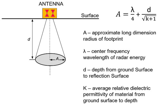 To estimate the depth of the anomalies interpreted as the thermal surging, the travel-time distance (ns) axis of the GPR images was transformed into a depth (m) axis using a radar-wave velocity of 10 cm/ns, as previously estimated by hyperbola fitting. Regarding the 500 MHz data, the thermal sources were registered at ~10 and ~15 ns (red and blue boxes, respectively), which resulted in ~0.50 and ~0.75 m in depth, respectively. On the other hand, the thermal source interpreted from the 200 MHz data at ~40 ns (blue box) resulted in a ~2.0 m depth. The different depths obtained for the thermal source highlighted in the blue box (the one detected by the two frequencies used) can be explained by the difference in the resolution range. Lower frequencies provide higher capacity of penetration but lower resolution, while higher frequencies yield lower capacity of penetration but higher resolution. Under optimal conditions, the 500 MHz frequency antennas yielded vertical and horizontal spatial resolutions of 5 and 90 cm (considering a vertical distance of 1 m between the antenna and the reflector surface), respectively, whereas the 200 MHz frequency antennas provided a vertical resolution of 12.5 cm and a horizontal resolution of 150 cm. This could explain why the 500 MHz antenna is detecting two different springs. Observing the 200 MHz data in Figure 5d, it is possible to appreciate a wider footprint of the anomaly than for the 500 MHz data and, what is more, it could be said that two reflectors overlapped. Figure 6 illustrates the simplified GPR antenna footprint for bistatic dipole antennas [24]. Considering the equation in Figure 6, the long dimension radius of footprint (A) for the 500 and 200 MHz (with vertical distance of 1 m between the antenna and the reflector surface) resulted in 40 and 48 cm, respectively. This ratifies how a lower-resolution image would cause features to appear larger than they are. It should also be mentioned that higher-frequency antennas, such as the 500 MHz antenna, are more sensitive to ambient noise, such as the presence of metal compounds from the water.