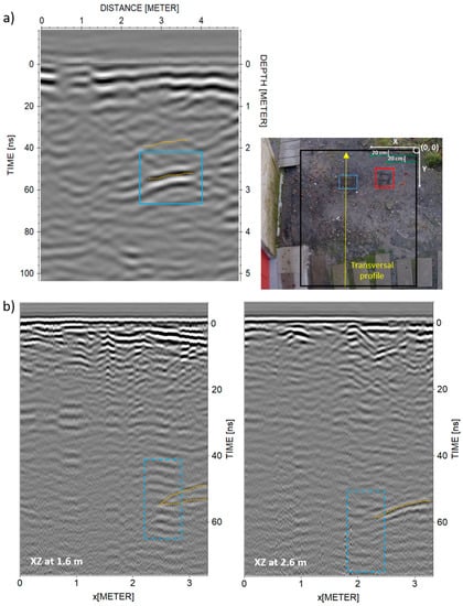 Additional 200 MHz transversal profile acquired along the probable fractured area (a), and 500 MHz XZ at 1.6 and 2.6 m in y-line (b).