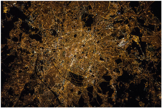 Georeferenced Earth imagery acquired at daylight is widely available nowadays, even in free and open forms from public missions such as Landsat or Sentinel-2 [1]. For nighttime light (NTL) imagery, however, the variety of data is much lower. For low-resolution needs, the Day/Night Band (DNB) of the Visible Infrared Imaging Radiometer Suite (VIIRS) has been providing NTL data since 2011 with a resolution of 750 m [2] with a daily global revisit and pan-chromatic band. For high-resolution needs, there are presently no publicly available global NTL data. The only available option in this case is the imagery acquired manually and sporadically by astronauts on the International Space Station (ISS), which is available on the Gateway to astronaut photography of Earth [3,4]. An example of such an astronaut photograph is shown in Figure 1. This image of Paris, France, for example, was acquired in April 2015 using a Nikon D4 electronic still camera with a focal length of 400 mm. From the horizontal sensor size of 36.0 mm with 4928 px, approximate altitude of 394 km and the tilt angle of , provided for this image, a ground sampling distance of ~7.6 m is derived. This collection of high-resolution data acquired at nighttime is unique and enables completely novel applications. As almost all light sources at night are man-made, their changes over time, in particular in urban areas, provide a good estimate of human impact and light pollution. The extent of night-time illumination provides valuable information on energy consumption for artificial light, urbanization, electricity access, socio-economy, hazards, risks, disasters, monitoring of conflicts, natural properties of the atmosphere and surface, and biological risks and opportunities: for example, human health, well-being, and influences on animals and plants [5]. A prerequisite for any of these studies, however, is a high geolocation accuracy of the NTL data. Unfortunately, due to the manual acquisition of these astronaut photographs, the images do not offer much geocoding information. Typically, information is available on time, position, camera model, sensor format and focal length, but not, in particular, on the precise attitude. The citizens science project Cities at Night and the associated project Lost at Night have been started to tag, locate and geocode the astronaut photographs [6]. Such an approximate geocoding is already useful for several use cases. For many applications, however, such as change detection over time or fusion with other data sources, a more accurate georeferencing is required.