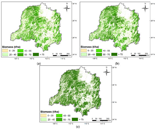Biomass of forest and shrub. (a) Biomass of the year 2000; (b) biomass of the year 2010; (c) biomass of the year 2020.