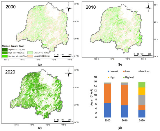 Biomass carbon density levels of forest and shrub. (a) Map of biomass carbon density levels of forest and shrub in the year 2000; (b) map of biomass carbon density levels of forest and shrub in the year 2010; (c) map of biomass carbon density levels of forest and shrub in the year 2020; (d) area statistics for different carbon density levels in the years of 2000, 2010 and 2020.