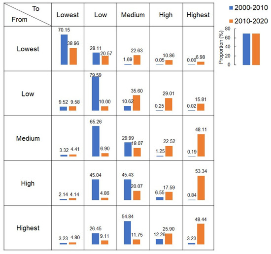 Interconversion proportions of different biomass carbon density levels from 2000 to 2020. The numbers on the histogram represent the ratio of the transition area to the area of the initial carbon density level.