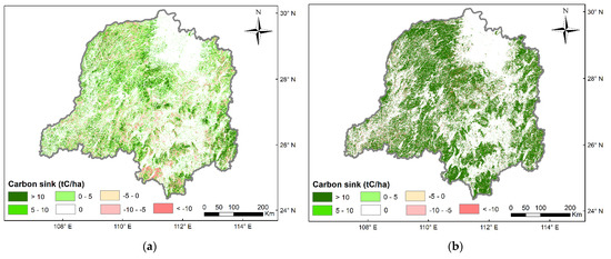 Maps of carbon sinks of forest and shrub from 2000 to 2020. (a) Map of carbon sink of forest and shrub between 2000 and 2010; (b) map of carbon sink of forest and shrub between 2010 and 2020.