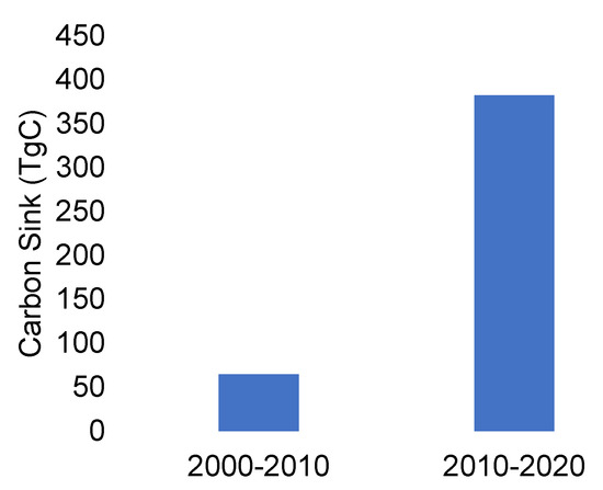 From 2000 to 2020, the quantity of carbon sink of the forest and shrub in the Dongting Lake Basin increased significantly (Figure 7 and Figure 8). The amount of carbon sink by forest and shrub increased from 64.64 TgC in the first decade to 382.56 TgC in the second decade.