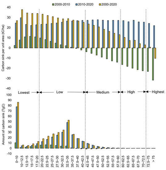 We calculated the total carbon sink and carbon sink per unit area at each initial biomass carbon density level to analyze the quantity and efficiency of carbon sink at different carbon densities over 20 years. In this part, we only analyzed the pixels that were constant forest or shrub from the year 2000 to 2020. We used the biomass carbon density of the year 2000 as the initial carbon density. We analyzed the change in carbon sink as a function of the initial carbon density in each period (2000–2010, 2010–2020, and 2000–2020) and the trends of carbon sinks at different carbon densities over time.