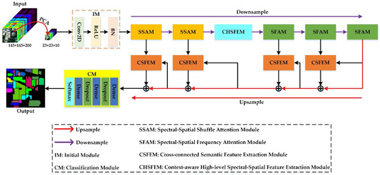 - To obtain the global context semantic features, we develop a cross-connected semantic feature extraction module (CSFEM) between the encoder part and the decoder part. The CSFEM can effectually suppress noisy boundaries. Meanwhile, the spectral-spatial shuffle attention features from the encoder phase can be weighted by the diverse high-level frequency attention features and select shuffle attention features that are more valuable to HSI classification, sequentially contributing to high-level frequency attention features, restoring the boundaries of categories in the decoder phase.