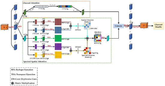 The network structure of SSAM is shown in Figure 2. The SSAM is performed based on a “Deconstruction-Reconstruction” structure. First, the SSAM divides the input general spectral-spatial features into multiple groups. Next, each group is split into two branches, i.e., channel attention and spectral-spatial attention. Then, we employ a simple concatenate operation and a shuffle unit [51] to integrate the two branches into one new group. Finally, the spectral-spatial features of each new group are aggregated, and we utilize the channel shuffle operation similar to ShuffleNet V2 [51] to enable information representation between any two new groups.